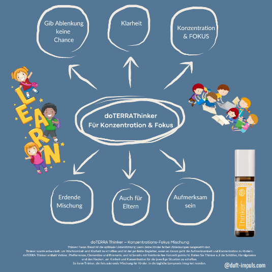 doTERRA Thinker enthält Vetiver, Pfefferminze, Clementine und Rosmarin, und ist bereits mit fraktioniertes Kokosöl gemischt. Rollen Sie Thinker auf die Schläfen, Handgelenke und den Nacken, um Klarheit und Konzentration für die jeweilige Situation zu schaffen. So kann Thinker, die fokussierende Mischung für Kinder, in die tägliche Lernpraxis integriert werden.